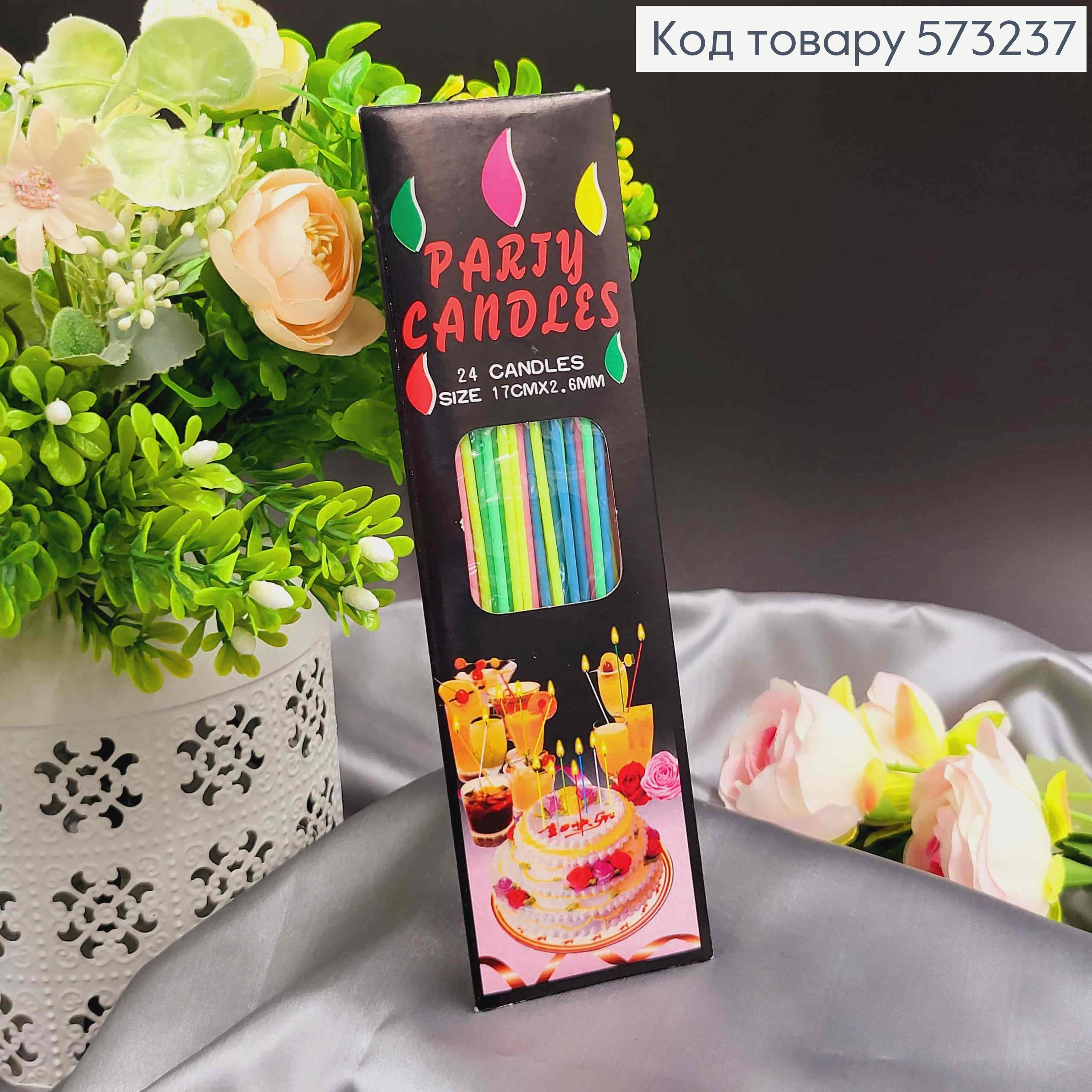Свечи для торта, 10мин горения, Тоненькие 17см, цветные, 24шт/уп