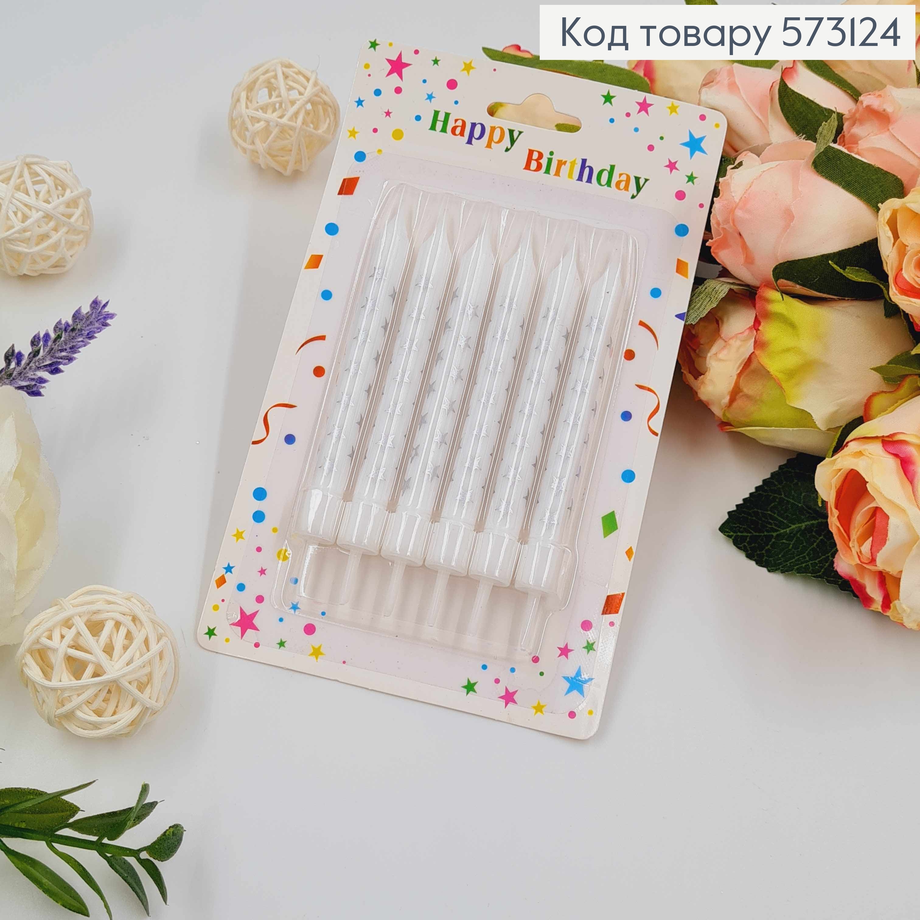 Свечи для торта, белые в серебряные звездочки, с подставками, 6шт\уп. 7+2см