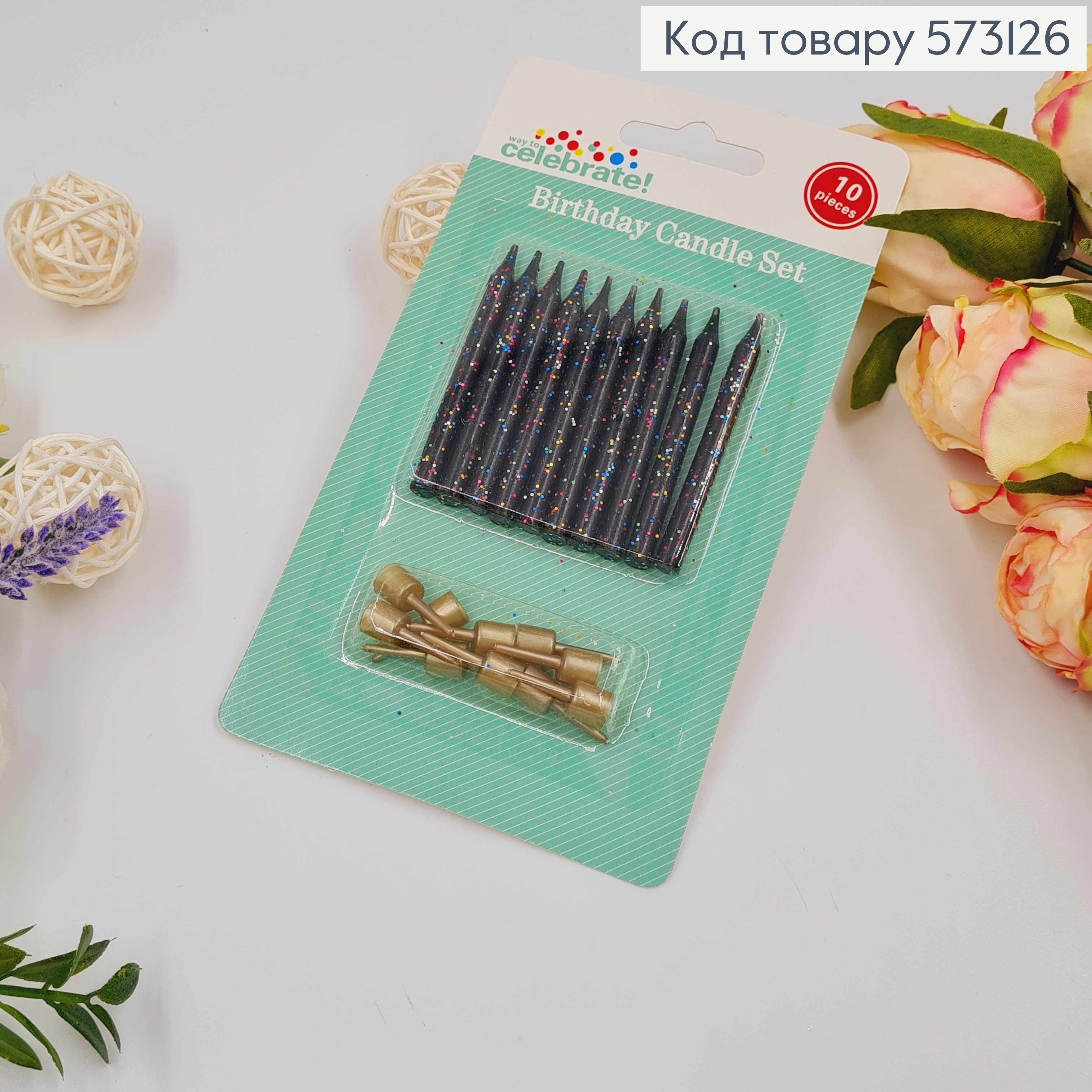 Свечи для торта, Черные в цветных блестках, с подставками, 10шт\уп. 6+2см