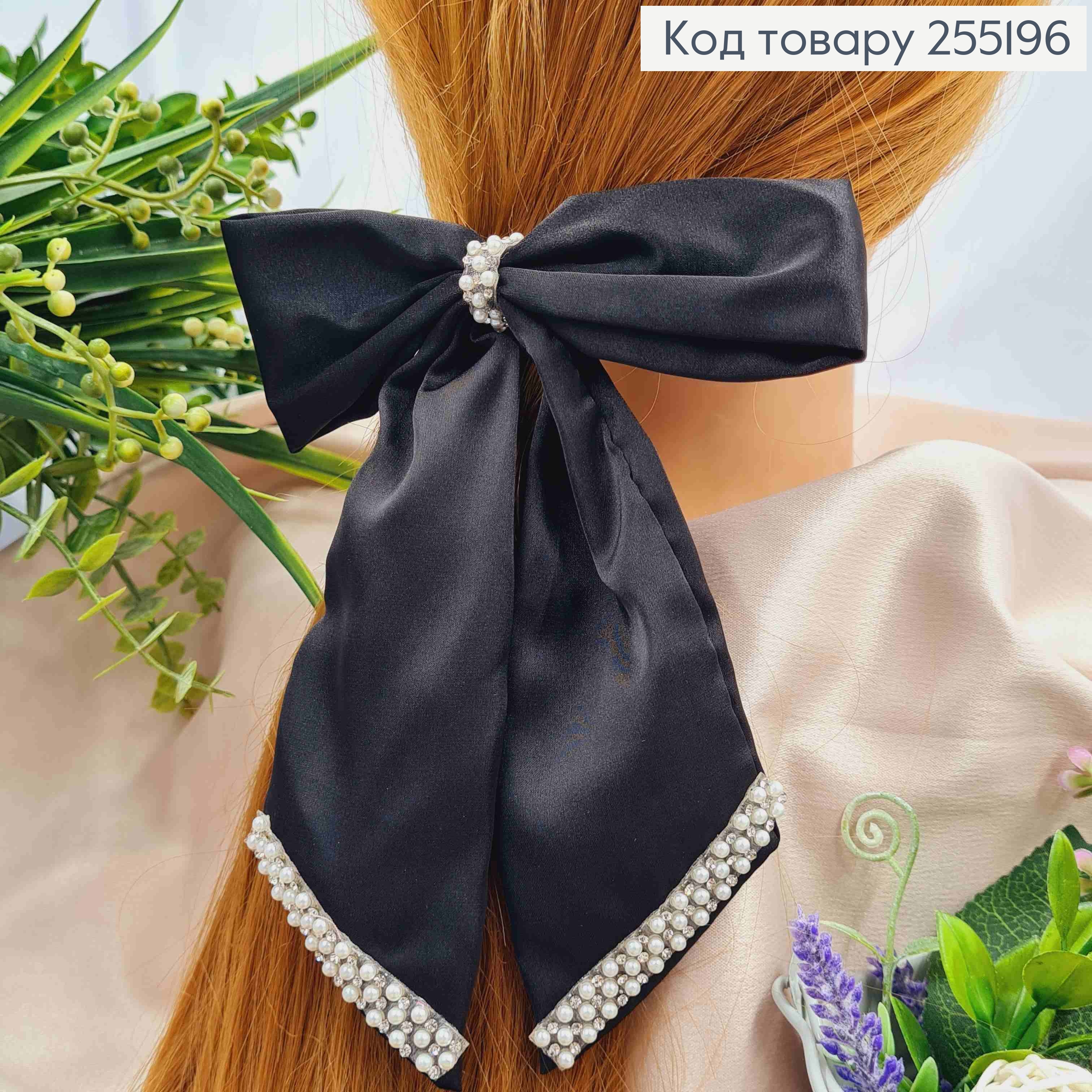 Заколка (7,5см) БАНТ ЧЕРНОГО цвета с Бусинками, легкий атлас, размер 12*17см, Украина