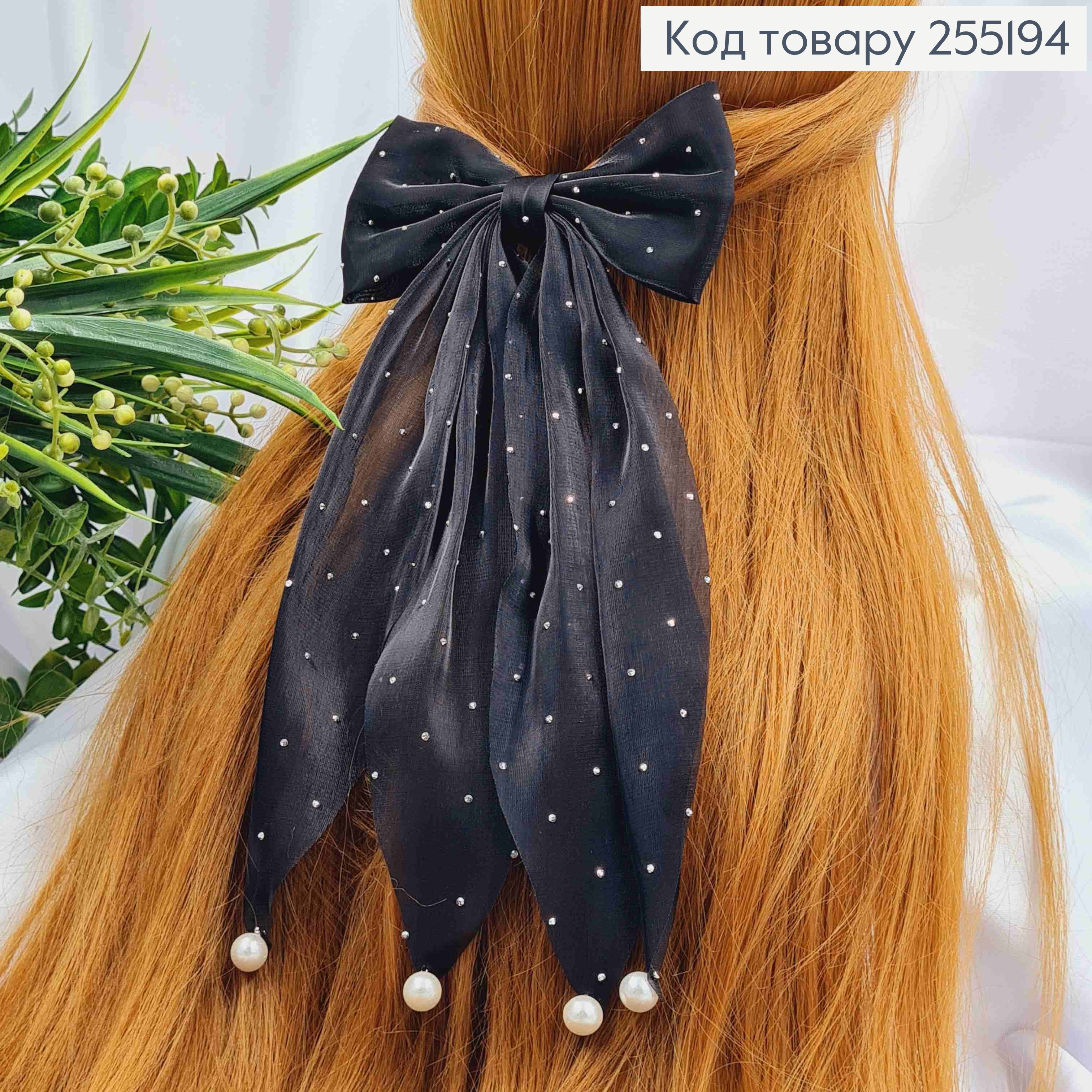 Заколка (7,5см) БАНТ ЧЕРНОГО цвета со Стразами и Бусинкой, размер 14*25см, Украина