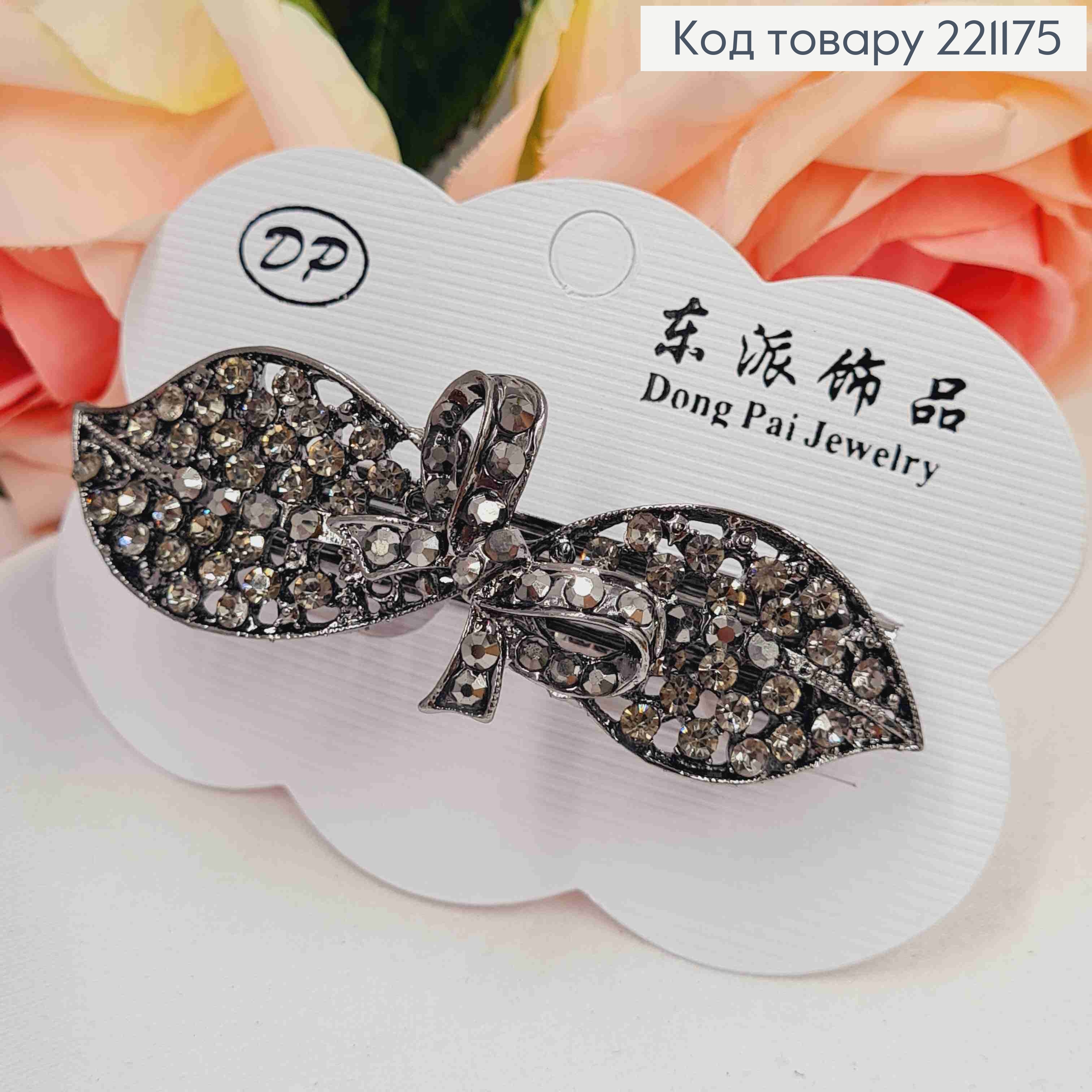 Заколка автомат, БАНТИК с Листочками в камешках, цвета Металлик, 8,5см