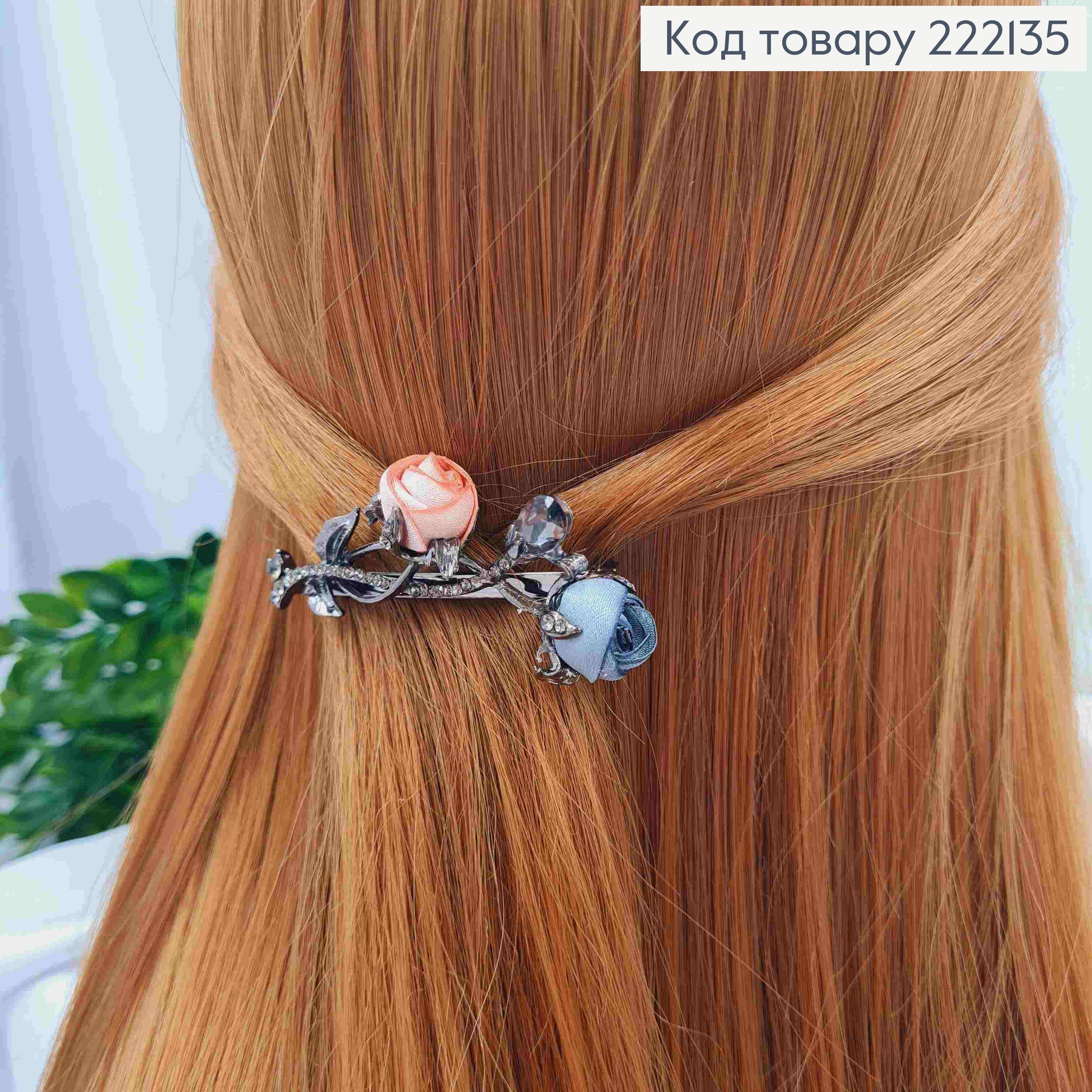 Заколка автомат Серебряного цвета 5,5см, Две Розы пастельных цветов с камешками.