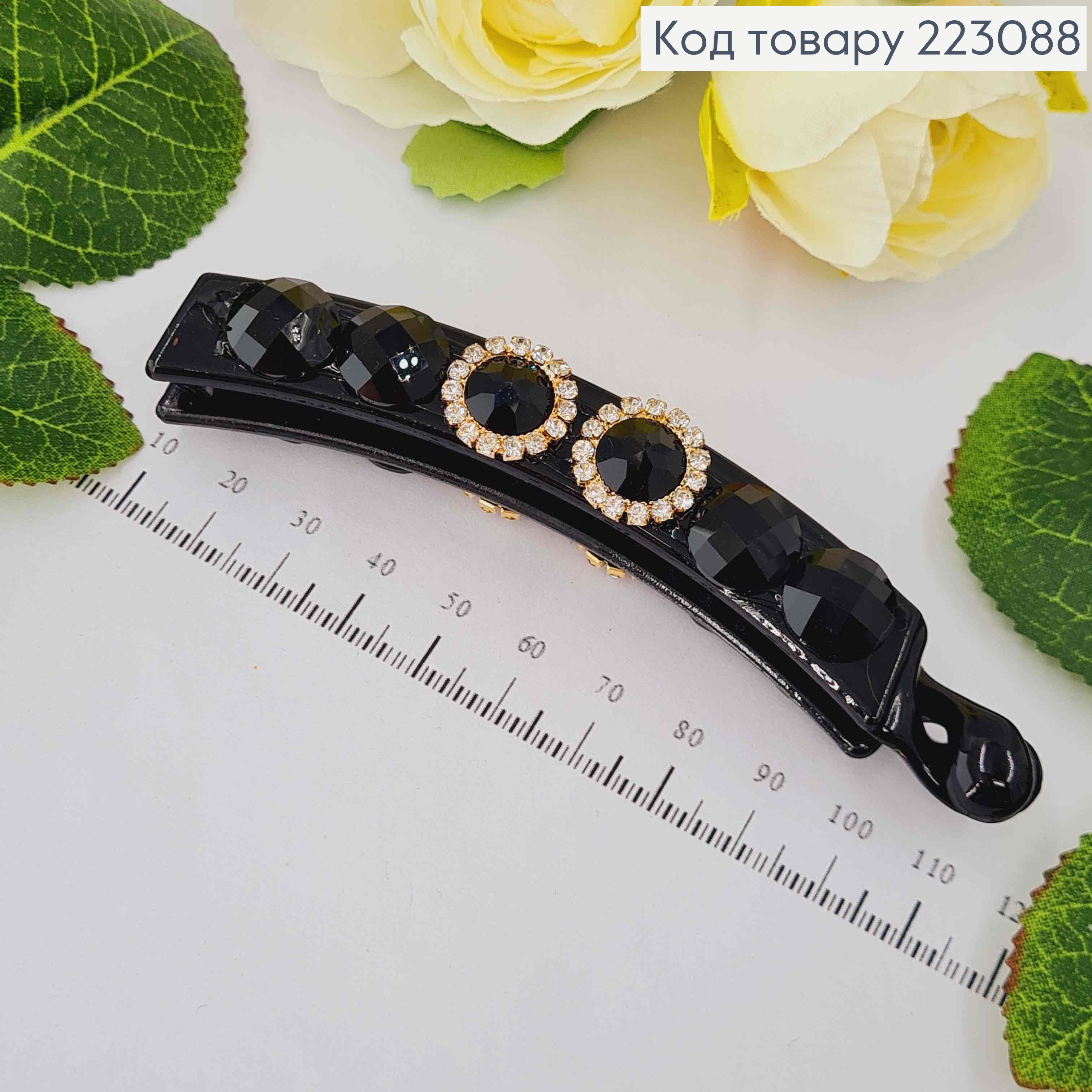 Заколка банан, черная с черными камешками и двумя цветочками из камешков, 11см.