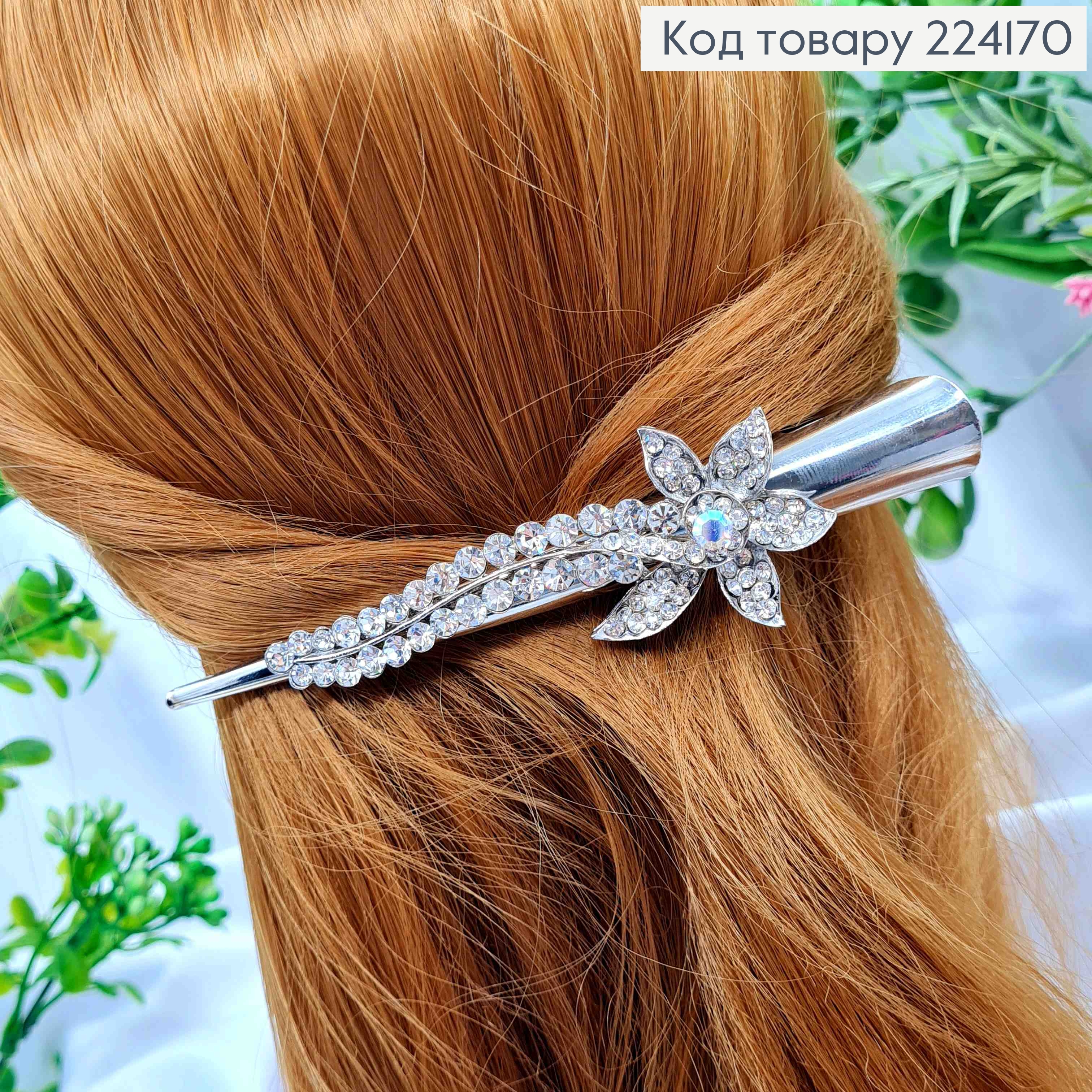 Заколка стрела металл с цветком в блестящих камнях, серебряного цвета, 13см. 224169 фото
