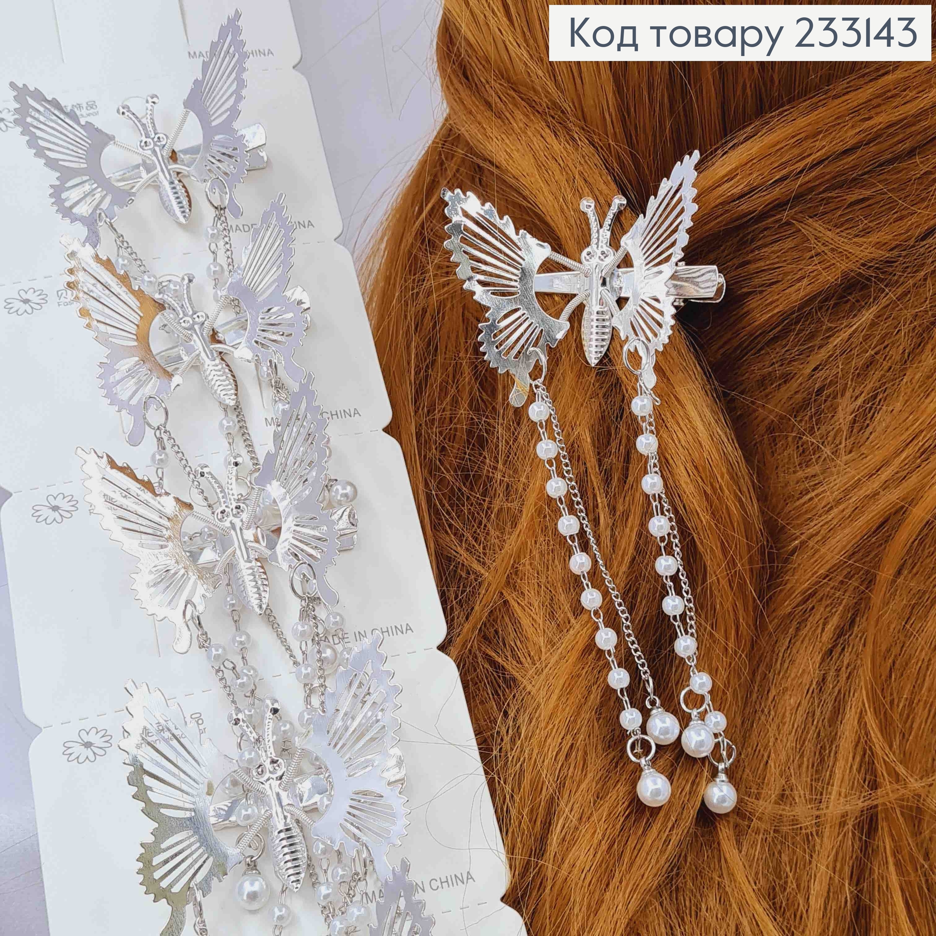 Заколка стрела Бабочка с жемчужками на цепочке, подвижными крыльями, 6*4+8см, серебряного цвета